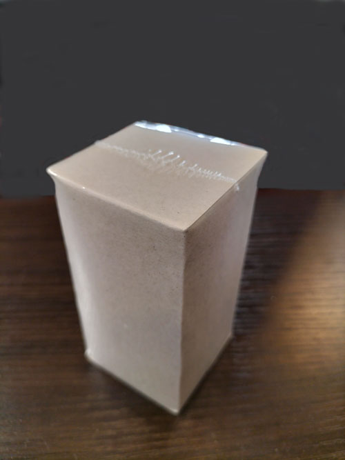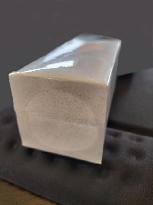 透明フィルムは品物に合わせてオーダーで作成する場合と、規格品を使用する場合があります。オーダーで作成したほうがよりきれいに仕上がりますが、小ロットですと割高になります。規格品でちょうどいい寸法のフィルムがあればこちらを使用することもおすすめします。