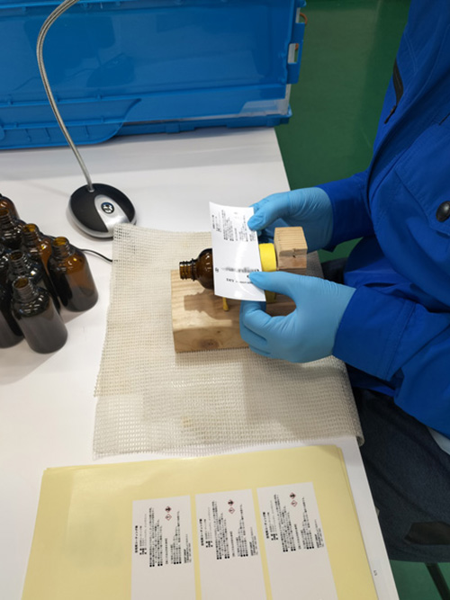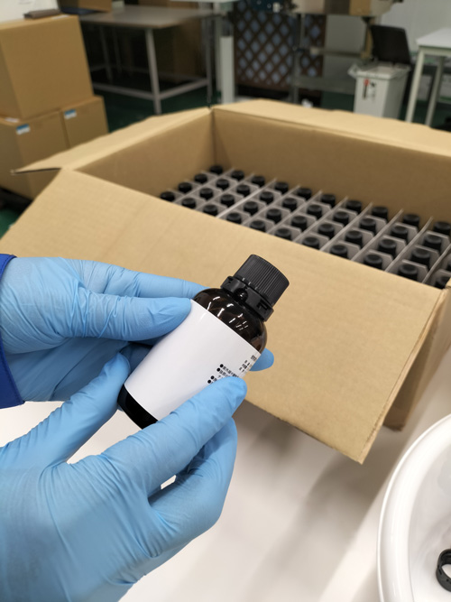 お客様に御支給いただいたシリコーンレジンオイルを、50mlのガラスボトルへ小分け充填しました。