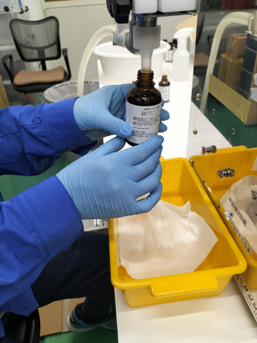お客様御支給のシリコーンレジンオイルを、50mlのガラスボトルへ充填しました。